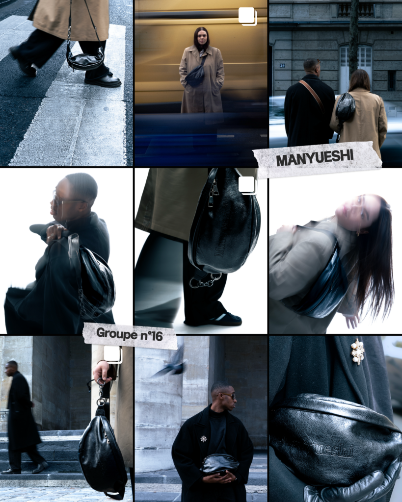 Le Groupe 16 a choisi d’explorer le mouvement : celui du corps, de la ville, du rythme quotidien. Le sac banane n’est plus un accessoire, mais une extension de la silhouette, un objet vivant qui accompagne chaque geste.